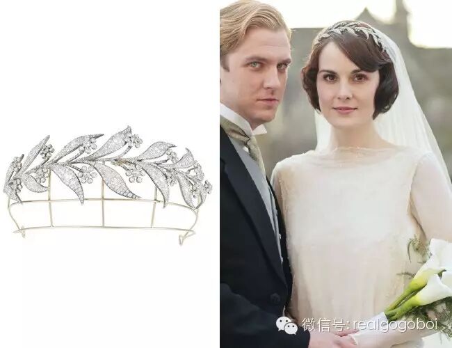 虽然乍一看很简洁,但婚纱上绣满了珍珠和水晶。做这条婚纱花了4000英镑,是全剧最贵的衣服。钻石花冠来自英国珠宝商Bentley & Skinner,价值约12.5万英镑。